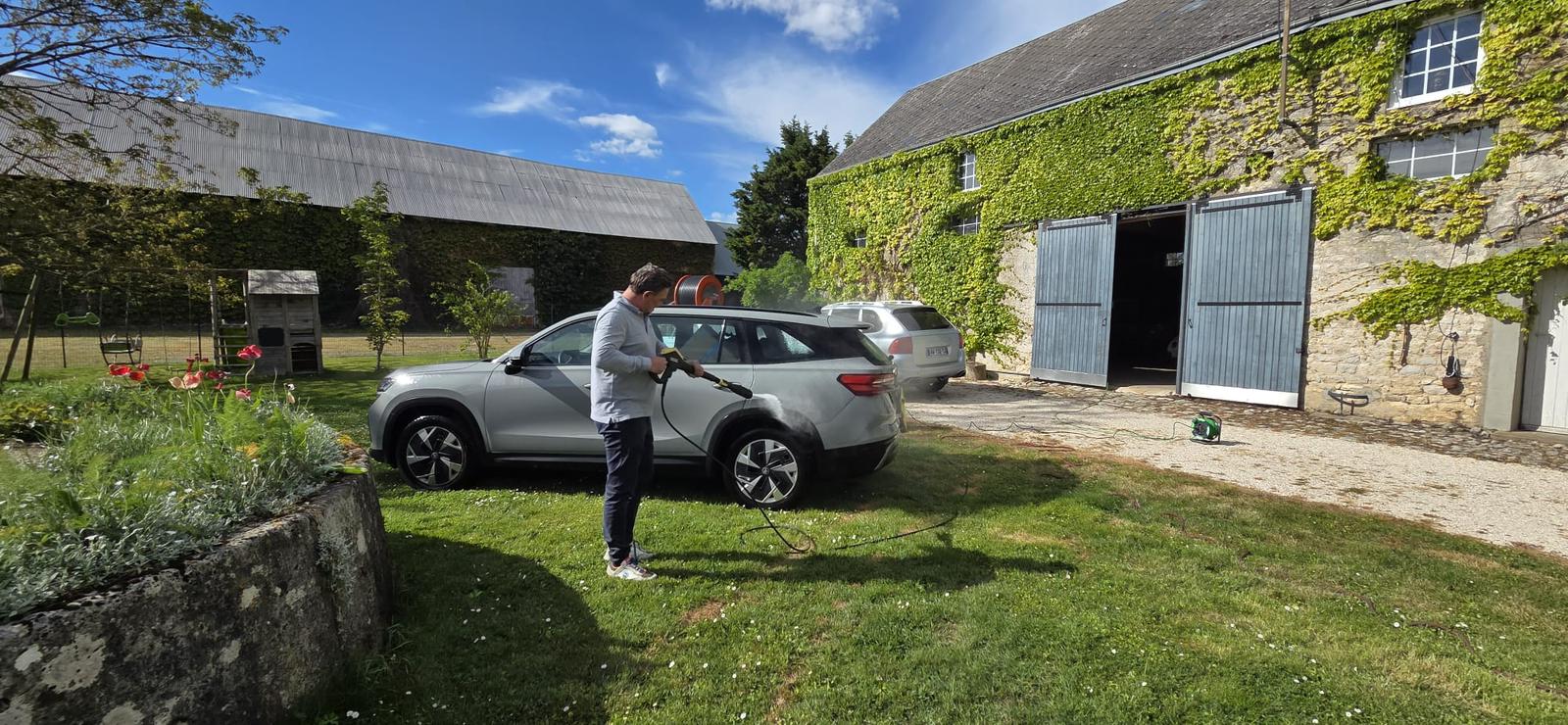 Clin d’œil à un client pour son accueil et sa bonne humeur — allant même jusqu’à prêter son Karcher pour sauver notre véhicule après une attaque aérienne particulièrement… efficace!